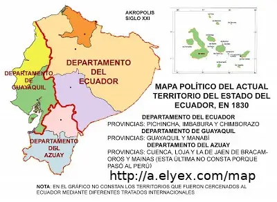 Para el 22 de septiembre de 1830 se emite la primera Constitución, declarando que los departamentos del Azuay, Guayaquil y Ecuador consolidados formando un solo cuerpo independiente con el nombre de Estado del Ecuador.